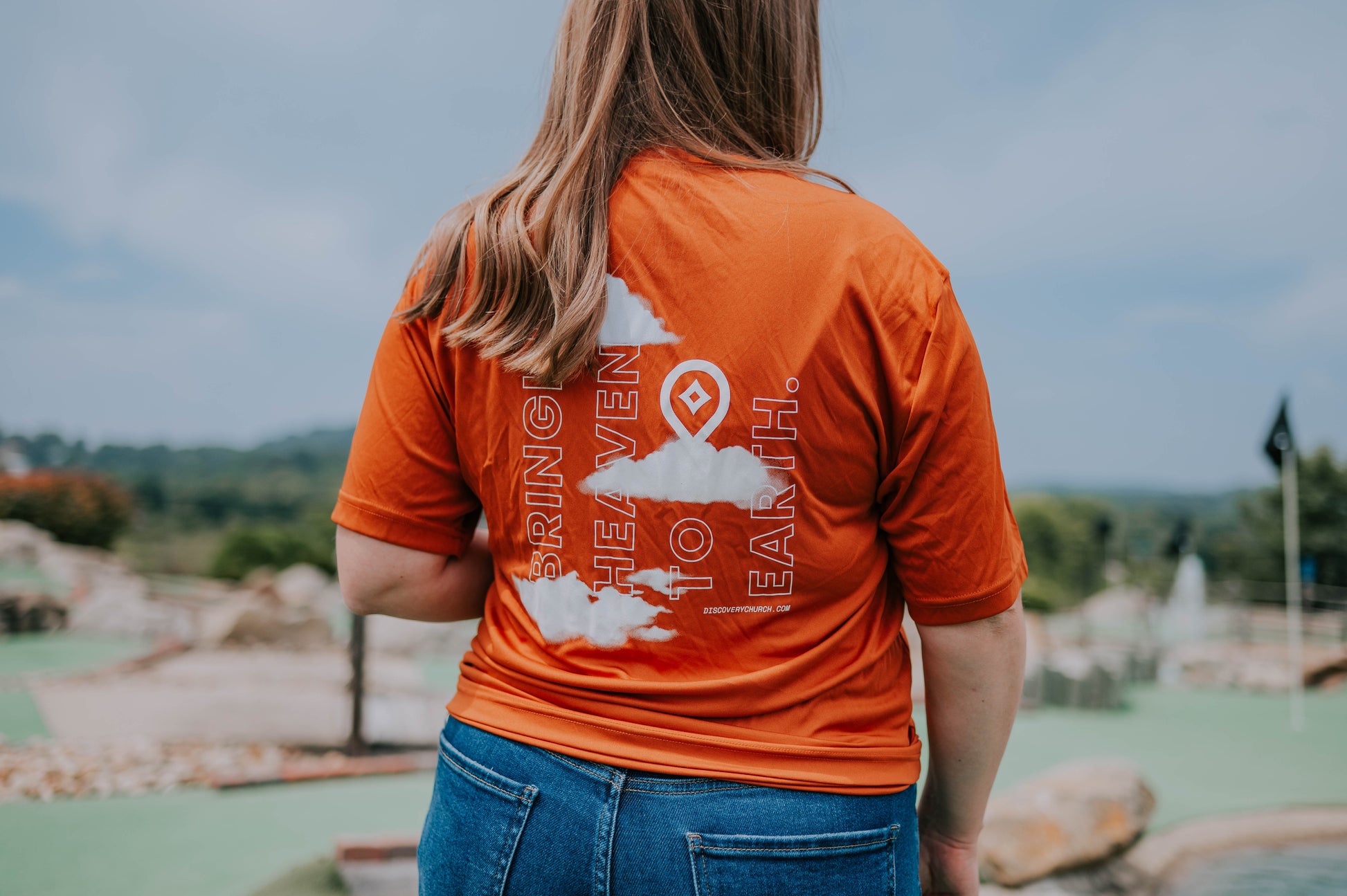 Lightweight, moisture-wicking, and purpose-filled, this Discovery performance tee keeps you cool while carrying the message forward. The front features a minimalist white cloud + Discovery Pin design, while the back declares our mission boldly: BRINGING HEAVEN TO EARTH