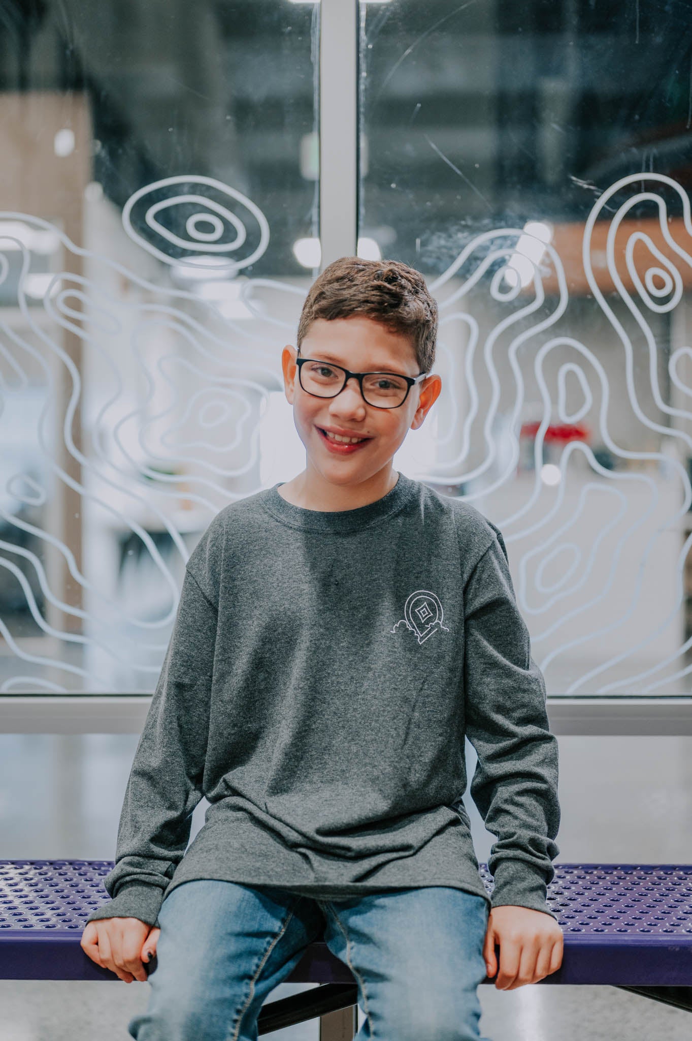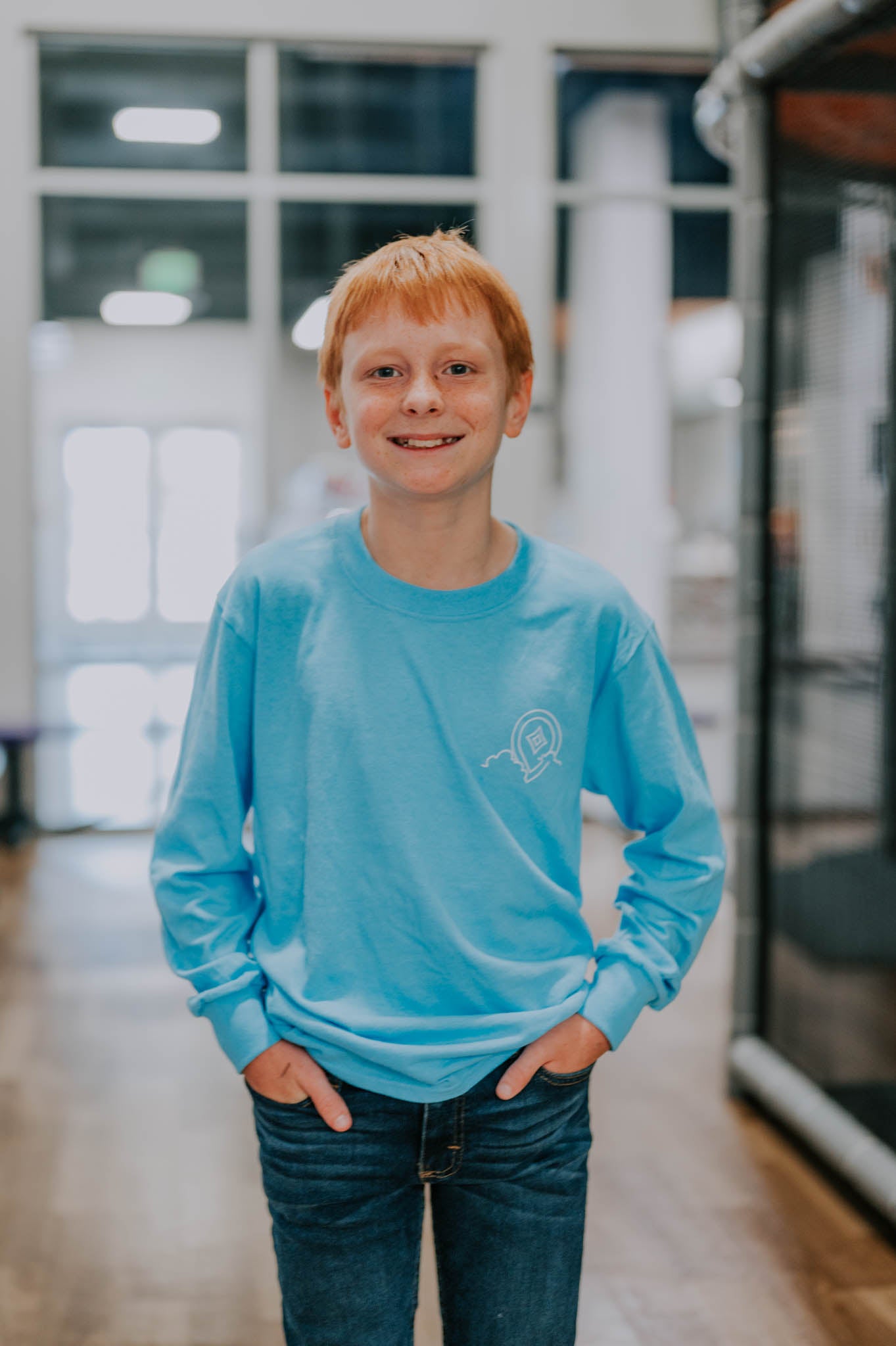 This long sleeve tee features the Discovery Pin cloud logo on the front and a topographic map on the back.